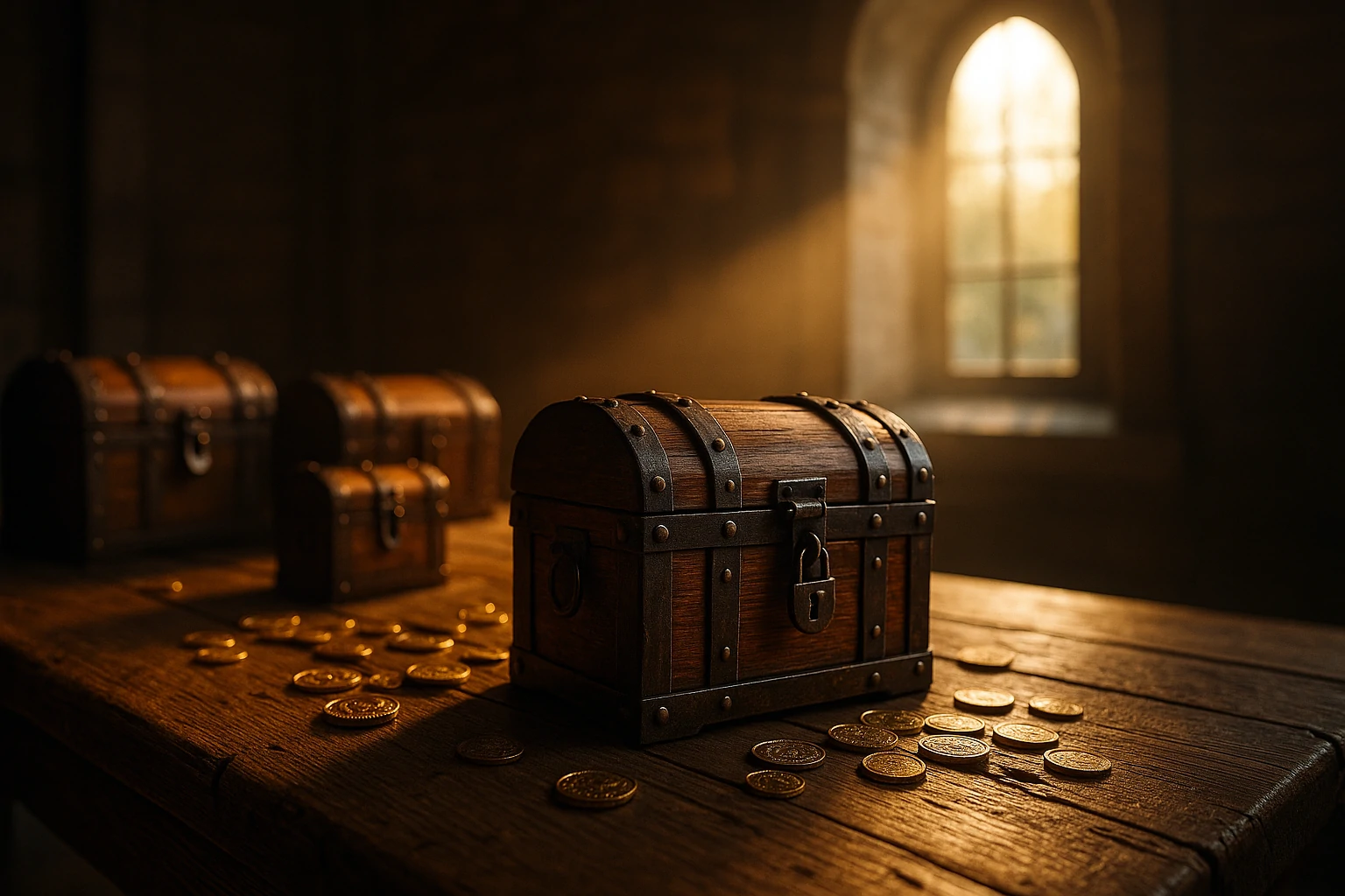 Medieval reward table with glowing treasure chests, scrolls, coins, and alliance gift boxes in a stone hall lit by torches