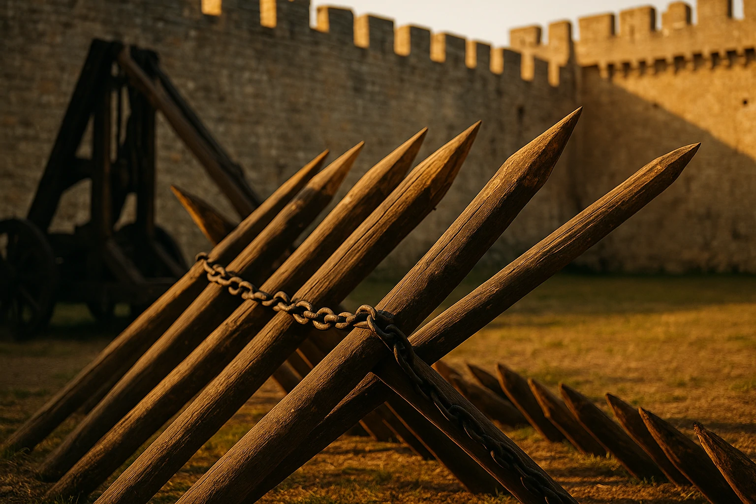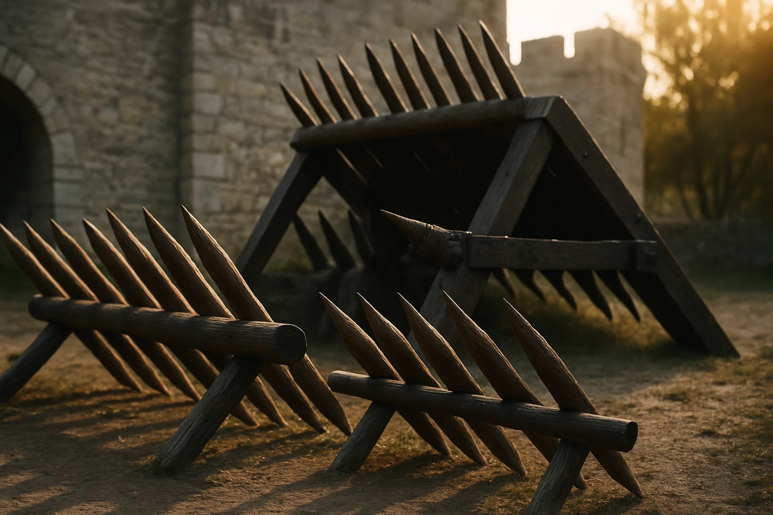 Medieval spiked wooden traps near a fortress wall under warm golden sunlight, used for strategic defense