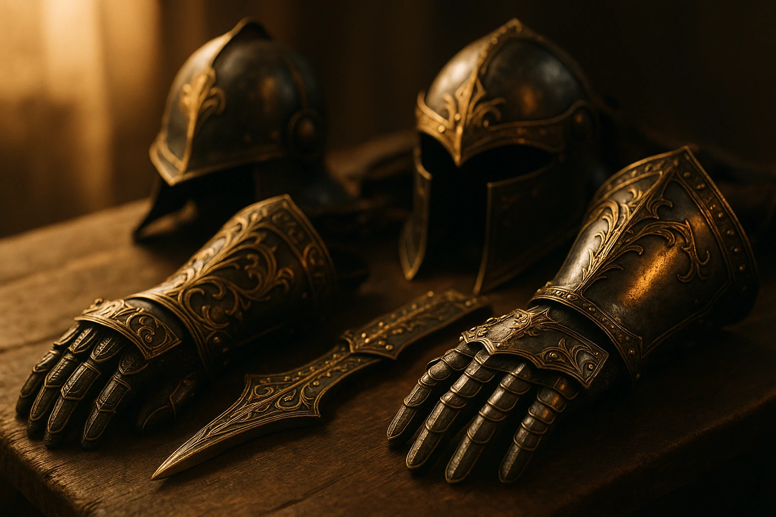 Realistic photo of medieval monarch gear with ornate gauntlets and helmets on a wooden table under glowing light