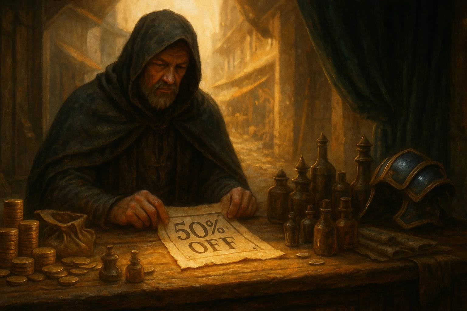 A cloaked medieval merchant examines a scroll marked “50% OFF” in his dimly lit Black Market stall. Bottles, coins, and rare armor lie on the table, hinting at powerful bargains for the wise.