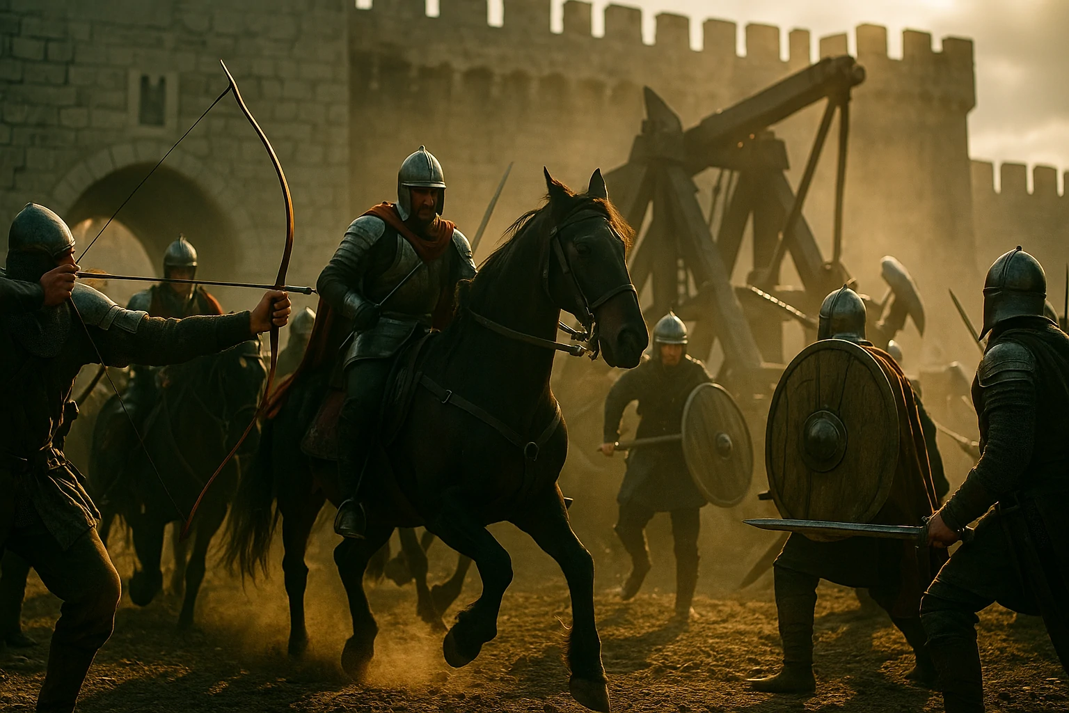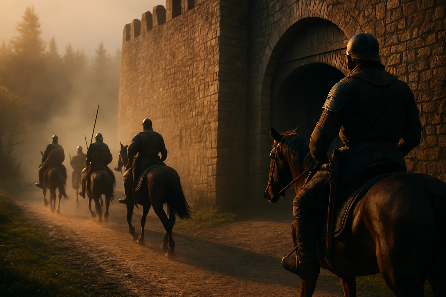 Medieval soldiers on horseback leaving a castle at dawn, illustrating the Ghost Rally trick in Evonygalore.