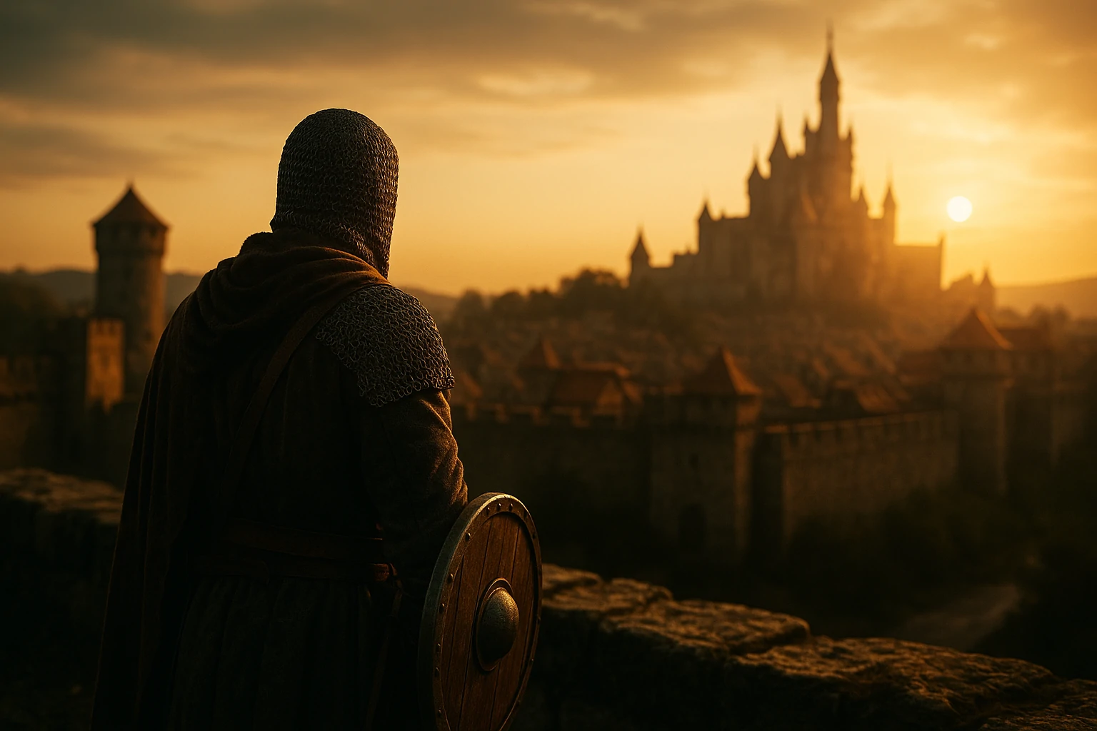 A lone medieval warrior gazes from atop a weathered city wall as the sun sets behind a grand walled fortress, ready to seize new territory and rewards in Evonygalore’s server transfer strategy.