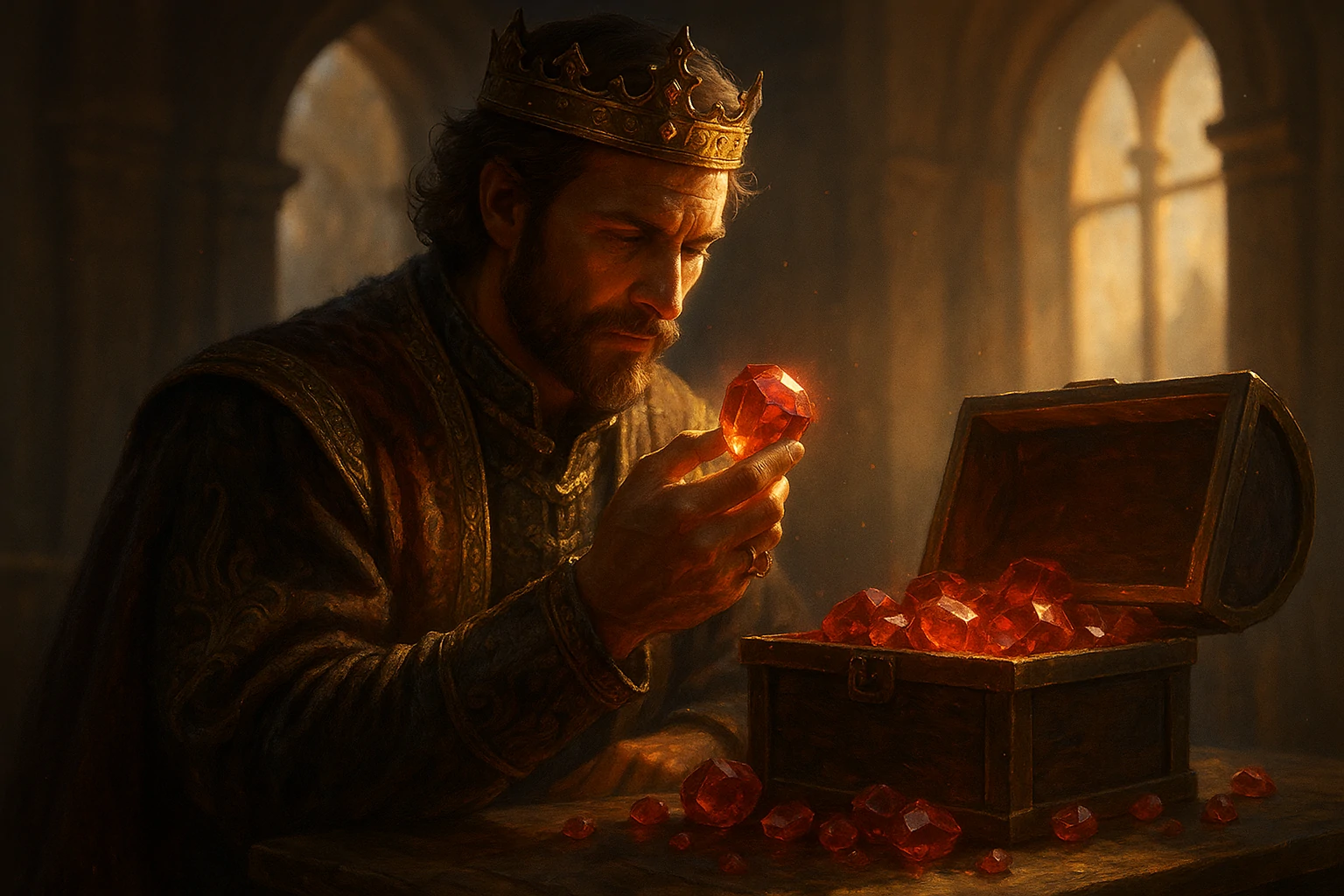 A medieval king studies a glowing red gemstone near a treasure chest full of similar gems in a sunlit royal chamber, representing VIP reward strategy in Evonygalore.